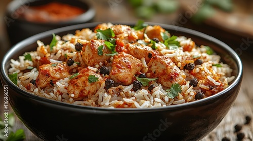 chicken, rice, food, spicey, dish, bowl, meal, dinner, lunch, cookery, delicious, tasty, healthy, protein, meat, cooked, hot, pepper, herb, spice, parsley, cilantro, coriander, cumin, turmeric, ginger, garlic, onion, tomatoes, vegetable, sauce, gravy, curry, indian, asian, ethnic, traditional, homemade, receipe, eatery, cafes, catering, cooking, epicure, nourishment, diet, fresh, table, wood