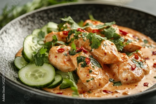 chicken, curry, spicey, asian, food, cookery, delicious, dinner, receipe, meal, plate, bowl, cooked, tasty, healthy, eatery, lunch, dish, eat, fresh, ingredient, cooking, preparation, spice, herb, cilantro, cucumber, red, chili, sauce, creamy, siam, vietnam, oriental, exotic, epicure, comfort, favor, image, photo, stock