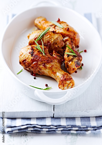 Spicy Chicken Drumsticks with fresh herbs. White wooden background
