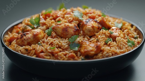 chicken, rice, bowl, spicey, food, dish, meal, dinner, cookery, cooking, delicious, tasty, healthy, fresh, eatery, plate, portion, eat, appetising, ingredient, receipe, preparation, savoury, favor, texture, aroma, gastronomy, culinary, dietary, lunch, breakfast, vegetable, herb, spice, seasoning, epicure, photo, image, background, studio, shot, dark