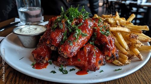 wing, chicken, fries, potato, spicey, sauce, food, meal, dinner, lunch, eatery, plate, dish, delicious, tasty, hot, crispy, crunchy, savoury, juicy, red, orange, garnish, parsley, herb, side, portion, eat, eating, favor, favor, comfort, cookery, culinary, epicure, appetising, deliciously, satisfying, hunger, crave, addiction, unhealthy, fast food