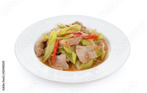 Spicy fried pork with chilli on white plate