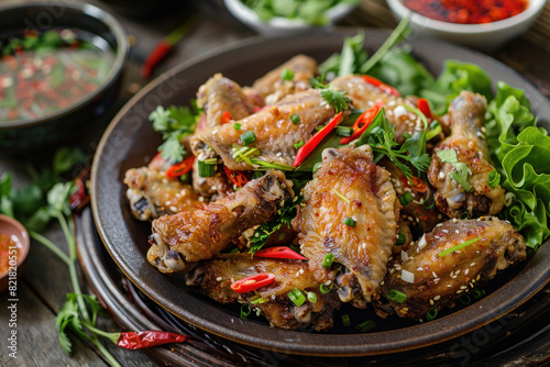 Spicy Grilled Chicken Wings with Fresh Herbs and Chili Peppers on a Rustic Plate