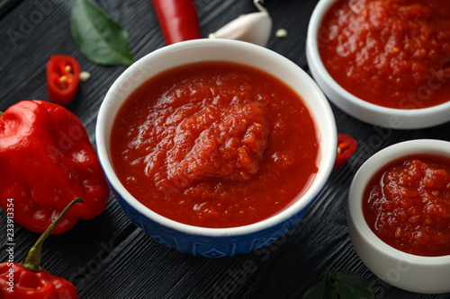 spicy hot sweet chili sauce with mix of chilli pepper, garlic and tomatoes on rustic wooden background