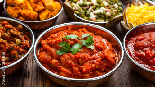 Spicy Indian Cuisine with Varied Dishes in Vibrant Colors and Aromatic Flavors in Traditional Setting : Generative AI