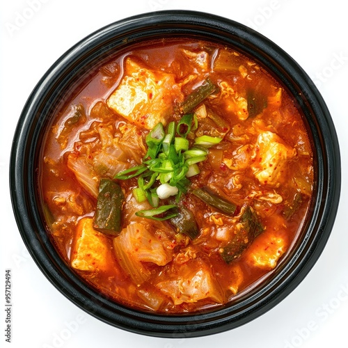 kimchi, stew, tofu, soup, green, onion, bowl, black, spicey, korean, food, dish, cookery, asian, red, white, background, isolated, delicious, savoury, fermented, cabbage, favor, hot, healthy, meal, lunch, dinner, garnish, fresh, tasty, vibrant, hearty, comfort, traditional