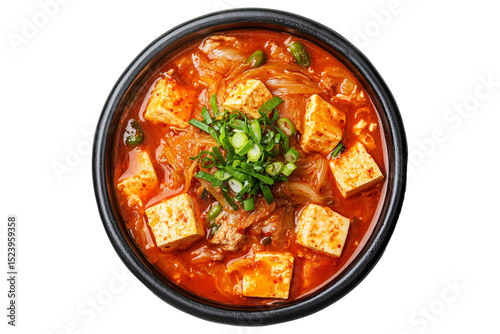 Spicy Korean kimchi jjigae with tofu, mushrooms, and green onions served in black bowl isolated on white transparent background, traditional Asian cuisine concept
