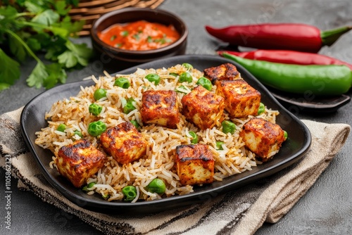 Spicy Paneer Rice with Fresh Vegetables and Accompanying Sauce