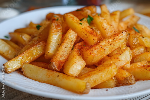 french fries, potato, paprika, spice, seasoning, crispy, gold, delicious, tasty, food, snack, side dish, fast food, junk food, eatery, cafes, pub, bar, take-away, dinner, lunch, meal, hot, salty, savoury, crunchy, texture, closeup, detail, photo, food photography, appetising, fresh, homemade, cooked, plated, garnish, parsley, white plate, background, image, picture, high-quality
