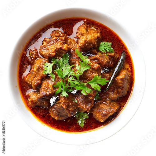 Spicy Red Lamb Curry in White Bowl Garnish with Cilantro isolated on a transparent background red curry