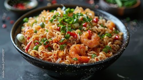 noodle, shrimp, spicey, asian, food, bowl, green, onion, dinner, lunch, culinary, delicious, appetising, flavorful, fresh, savoury, tasty, epicure, cookery, dish, meal, cook, receipe, eating, plate, healthy, ingredient, vegetable, red, orange, white, black, dark, closeup, still, life, photo, kitchen, eatery, oriental