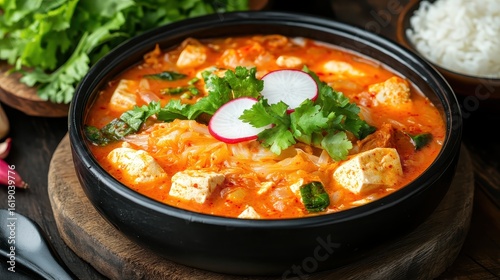 stew, tofu, herb, vegetable, dish, meal, cooking, cookery, comfort, food, warm, broth, spice, favor, preparation, rustic, healthy, ingredient, cilantro, radish, serve, wooden, table, garnish, savoury, bowl, rice, fresh, homemade, dining, appetising, receipe, nourishment, dinner, lunch, plate, vibrant, dinnerware, organic, colourful, aroma, freshness, culinary, asian, hot, epicure, vegetarian, soup