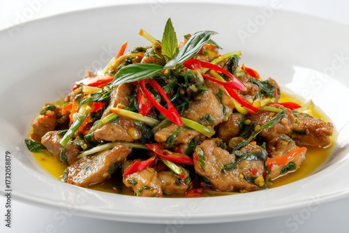 Spicy stir-fried chicken served with fresh herbs and colorful vegetables on a white plate