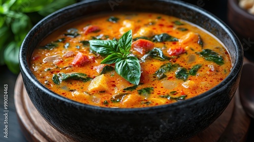 Spicy Sweet Potato and Basil Soup in Black Bowl