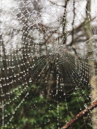 spider web with dew droplets in a moody natural forest and fog in the morning mist