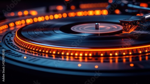 turntable, record, vinyl, music, audio, player, spinning, playing, sound, dj, nightlife, party, groove, dance, beat, rythm, bass, melody, speaker, audiophile, analog, nostalgia, retro, vintage, technology, entertainment, hobby, collector, listening, earphones, concert, stage, light, glowing, orange, dark, close, detail, speed, night