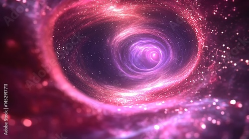 Spiral galaxy in pink, red, and purple hues with stars in cosmic darkness.