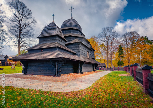 Splendid autumn view of famous black wooden Orthodox Church of Protection of the Mother of God in Rownia, Poland. Picturesque morning scene of of Polish countryside. Traveling concept background.