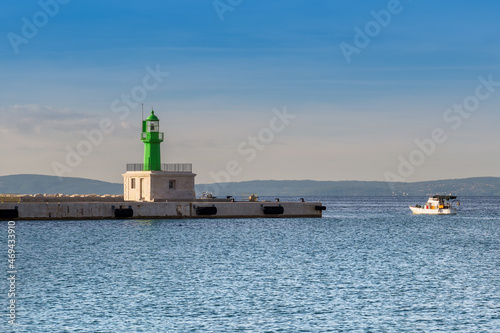 Split Lighthouse and boat in harbor in port of Adriatic sea coast, Split, Croatia.