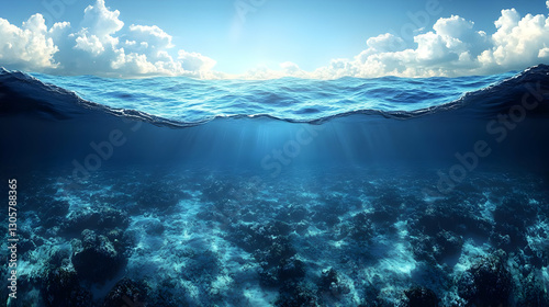 ocean, water, underwater, sea, blue, wave, sunlight, sun, sky, cloud, deep, bottom, surface, horizon, wide, panorama, landscape, nature, environment, view, still, light, clear, scene, floor, coral, seaweed, marin, fish, bed, sea foam, dark, turquoise