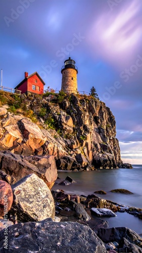lighthouse, minnesota, north shore, beacon, historic, landmark, coast, cliff, rocky, water, lake, sky, dusk, twilight, evening, architecture, building, navigation, maritime, travel, tour tourism, scenic, landscape, outdoors, nature, shoreline, coastal, structure, tower, light, cloud, horizon, vista, panoramic, view, destination, vacation, get-away, exploration, discovery, adventure, tranquil, serene, peaceful, calm, still