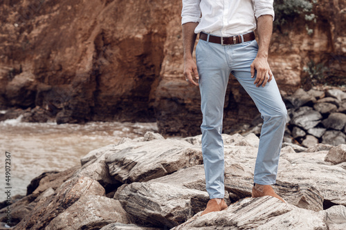 Spodnie męskie niebieskie chinosy, zdjęcie reklamowe.