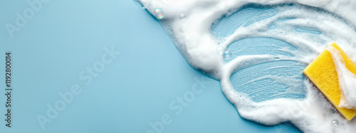 Sponge and Soap Foam Creating Swirls on Light Blue Background . Cleaning,Cleanliness and Hygiene Concept, Cleaning Service.