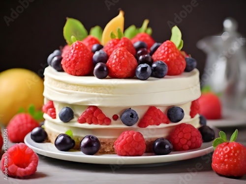 Sponge cake with strawberries, blueberries and cream