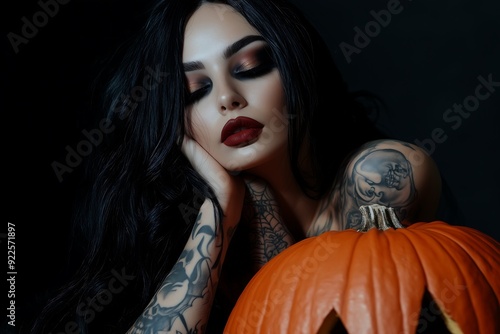 ghostly, vegetable, jack, fall, decoration, symbol, smile, isolated, fear, candle, woman, halloween, beauty, fashion, hair, face, black, magician, model, person, eye, lady, fantasy, dark, dress, horror, gothic, make-up, glamour, vampire, art, goth, people, vacation, red, studio, 1, brunette, lip, coiffure, skin, sensuality, pose, elegant