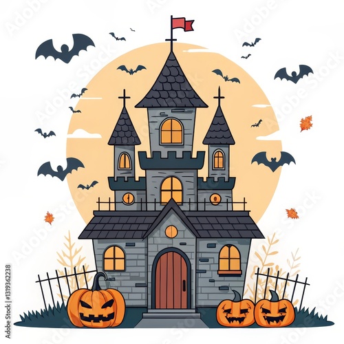 Spooky Cartoon Castle with Bats and Pumpkins, Halloween , Illustration