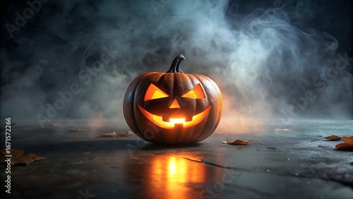 Spooky carved pumpkin with glowing eyes and mouth on a dark, misty background with fallen leaves