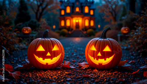 Spooky glowing jack-o'-lanterns welcome guests to a haunted mansion on Halloween night
