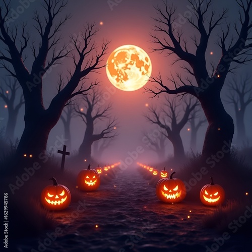 Spooky Graveyard Silhouette with Glowing Pumpkins and Full Moon – Halloween Abstract Background