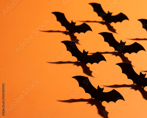 Spooky Halloween A swarm of Black Bats Against a vibrant Orange Backdrop creating long dark shadows
