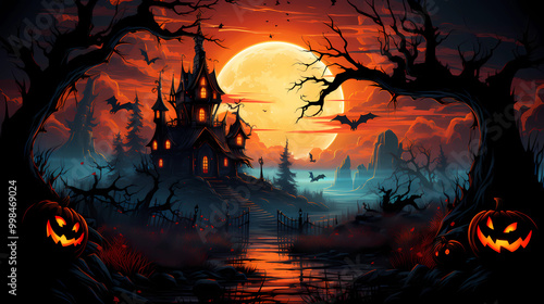 Spooky Halloween Background scene of haunted house and jack o lanterns and bats in flight against a red rising moon.