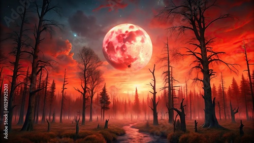 Spooky Halloween forest at night with moonlight, red sky, and dead trees in Depth of Field