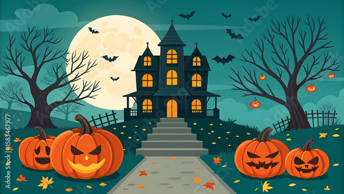 halloween, haunted, house, jack, lantern, pumpkin, bat, full, moon, night, skittish, eerie, scarey, decoration, holiday, celebration, autumn, fall, tree, dark, creepy, illustration, vector, cartoon, glowing, window, doorway, path, fence, cloud, sky, season, traditional, festive