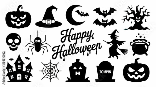 halloween, icon, skittish, design, element, party, invitation, decoration, festive, symbol, bat, pumpkin, sorcerer, spider, skull, tomb, ghost, cauldron, scarey, creepy, october, holiday, celebration, vector, graphic, illustration, design element, black-and-white, silhouette