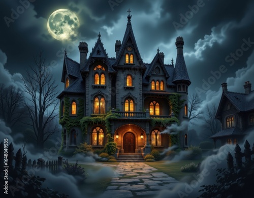 skittish, halloween, luxury home, jagged, rooftop, pointed, tower, broken, window, cracked, wall, twisted, chimney, overgrown, ivy, fog, curling, across, eerie, shadowed, courtyard, night, ai, generative