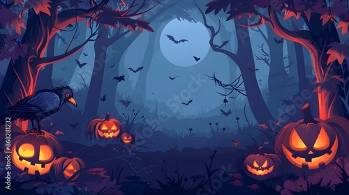 Spooky Halloween Night Forest Scene with Glowing Pumpkins and Ominous Crows