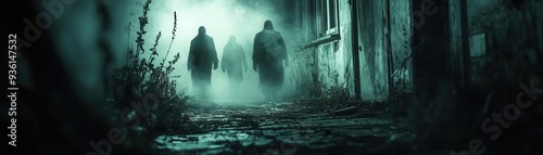 Spooky Halloween night haunted folklore with ghostly figures appearing in the shadows of a haunted mansion, Creepy, Cool Tones, Atmospheric