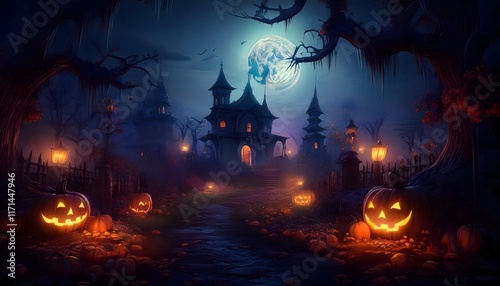 Spooky Halloween Night Haunted House Jack o lanterns Moonlit Path