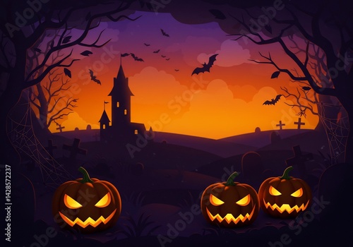 halloween, pumpkin, castle, night, dark, skittish, scarey, bat, cemetery, sunset, orange, purple, silhouette, tree, illustration, gothic, creepy, holiday, october, celebration, autumn, fantasy, grisly, mystery, enigmatic, gloomy, ominous, eerie, atmosphere, digital artwork, festive, dark background, night scene, digital illustration
