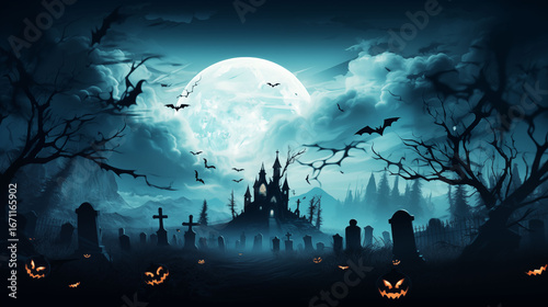 Spooky Halloween night sky with full glowing moon, flying bats, cloudy atmosphere, cemetery silhouette with crosses