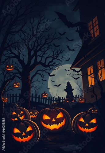 Spooky Halloween Night with Jack-o'-Lanterns and a Haunted House