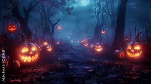 halloween, pumpkin, forest, skittish, scarey, night, haunted, background, dark, mystery, holiday, celebration, autumn, seasonal, fun, evil, moonlight, lantern, path, foggy, cinematic, hi-res, detailed, illustration, design, poster, banner, party, invitation, greeting, card, postcard, october, fire, flames, horror, jack, art, concept