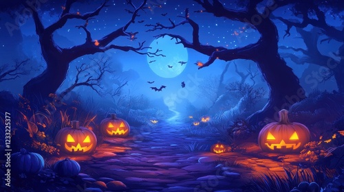 halloween, pumpkin, skittish, night, forest, tree, moon, bat, dark, autumn, october, scarey, mystical, magical, fantasy, illustration, digital artwork, artwork, graphic, background, wallpaper, scene, path, road, fall, harvest, celebration, holiday, creepy, mysterious, gothic, eerie, vibrant, colourful, blue, purple, orange, moonlit, haunted, pathway, cobbled