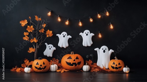 Spooky Halloween Scene: A festive Halloween scene with pumpkins, ghosts, and string lights set against a dark backdrop. Perfect for adding a touch of eerie fun to your Halloween projects.