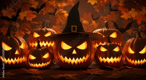 Spooky Halloween Scene: A cluster of illuminated jack-o'-lanterns, each with menacing eyes and grins, clustered together under a whimsical witch's hat, casting an eerie glow.
