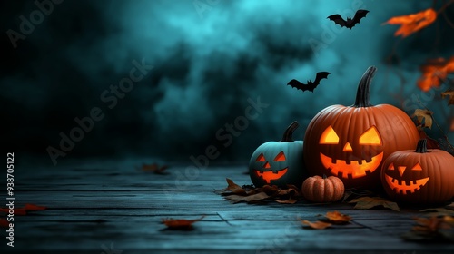 Spooky Halloween scene with glowing jack-o'-lanterns on a wooden floor, surrounded by bats flying against a dark, foggy background.